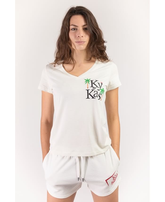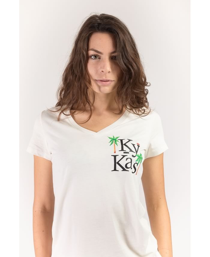Détail signature : le logo KY-KAS et ses deux palmiers brodés sur le cœur, symbole de liberté et d’élégance naturelle.