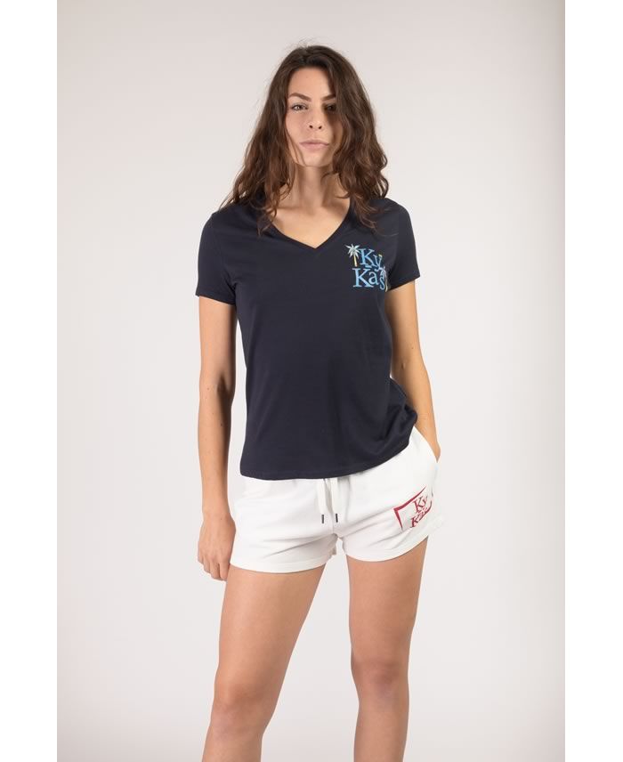 Son coloris bleu marine profond souligne votre silhouette avec sobriété, tandis que le logo KY-KAS et ses deux palmiers brodés sur le cœur ajoutent une touche d’authenticité