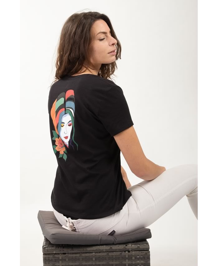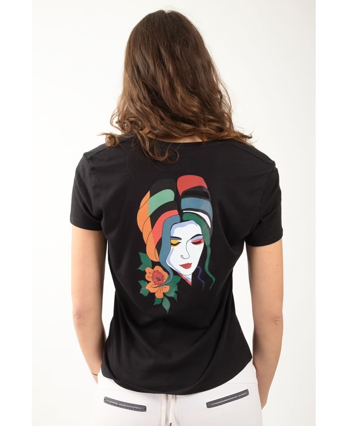 Dans le dos, une illustration vibrante d’un visage féminin multicolore accompagné d’une fleur transforme ce t-shirt en pièce artistique et méditative.